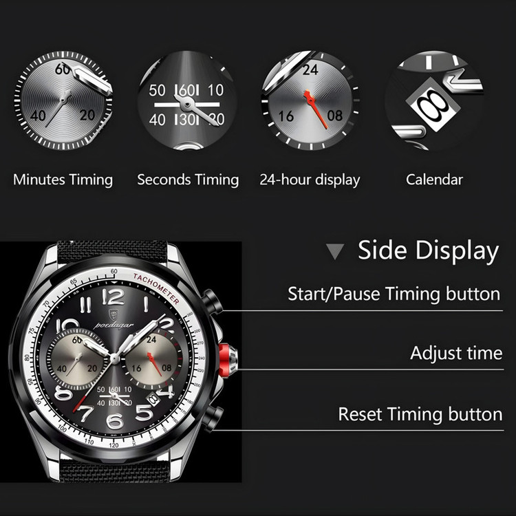 پوداگار مدلی نو《ویژگی های محصول: - نشانگر 24 ساعته - کرنوگراف - شمارش معکوس - دارای روز شمار - صفحه شب نما - شیشه تقویت شده( سافایر) - قطر صفحه 43 میلیمتر - ضدآب تا عمق بالا - رنگ ثابت - موتور کوارتز.