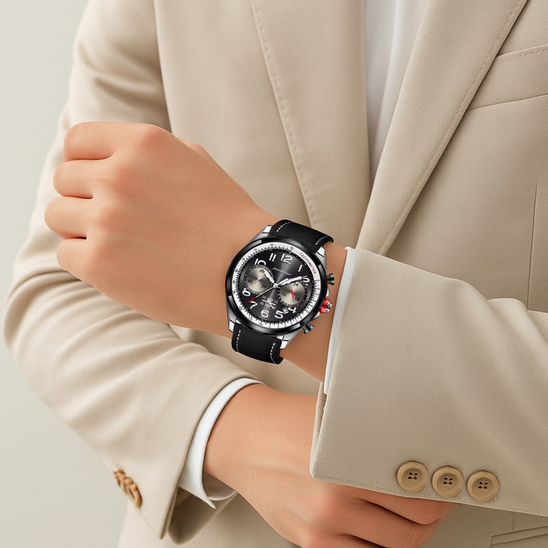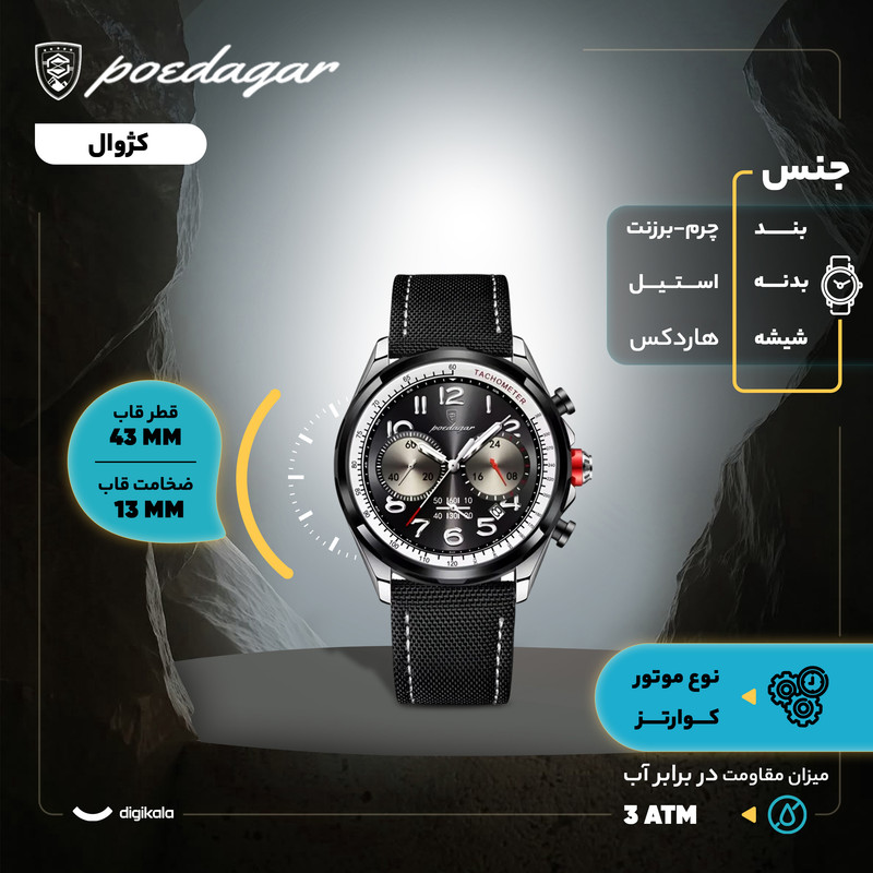 ساعت مچی عقربهای کوارتز مردانه پوداگار مدل سه موتور فعال با وزن 68 گرم، در عین سبک بودن، حس یک اکسسوری حرفهای و کاربردی را منتقل میکند. بدنهی استیل مشکی این ساعت با ضخامت 13 میلیمتر و قطر صفحه 43 میلیمتر، ابعادی را رقم میزند که کاملاً با مچ دست مردانه هماهنگ است و با فرم صفحه گرد و آنالوگ رنگ مشکی مات صفحه، هارمونی بینظیری از قدرت و زیبایی را ایجاد کرده است. شیشهی هاردلکس تقویتشده، مقاوم در برابر خطوخش است. موتور کوارتز دقیق ژاپنی، درون این ساعت وظیفهی اجرای کرنوگراف، تاریخشمار، نمایش 24 ساعته و عقربههای دو رنگ شبتاب را با دقت مثالزدنی انجام میدهد. انرژی موردنیاز این موتور توسط باتری تأمین شده که طول عمری تا 24 ماه دارد، نحوه بسته شدن آن نیز بند مشکی رنگ سگکی است. با مقاومت در برابر فشار آب تا 3ATM، استفادهی روزمره حتی در شرایط مرطوب نیز بدون نگرانی ممکن است. پوداگار انتخابی است هوشمندانه برای هر استایل؛ از کژوال و فشن گرفته تا رسمی و ورزشی است.