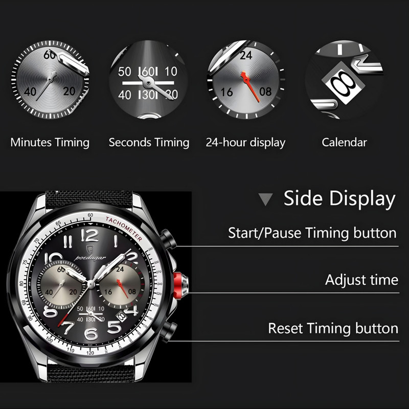 پوداگار مدلی نو《ویژگی های محصول: - نشانگر 24 ساعته - کرنوگراف - شمارش معکوس - دارای روز شمار - صفحه شب نما - شیشه تقویت شده( سافایر) - قطر صفحه 43 میلیمتر - ضدآب تا عمق بالا - رنگ ثابت - موتور کوارتز.