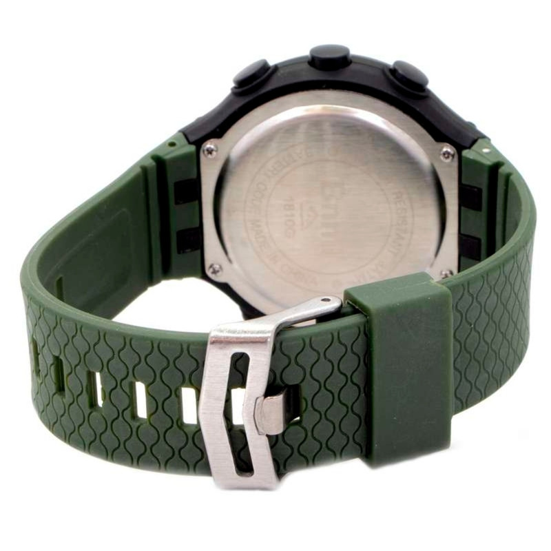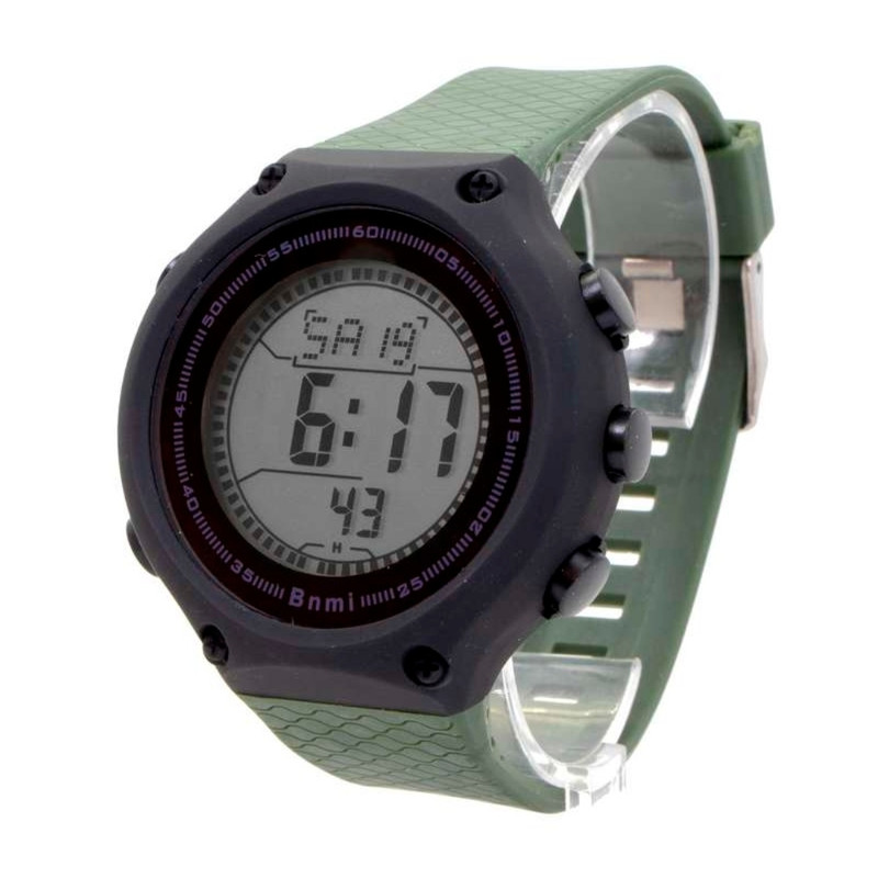 ساعت بنمی مدل bnmi1810G ضد آب در استخر نمایش ساعت نمایش روز ماه سال دارای نور پس سبز رنگ دارای آلار نمایش ساعت در دو حالت 24 ساعته و 12 ساعته دارای کرنومتر