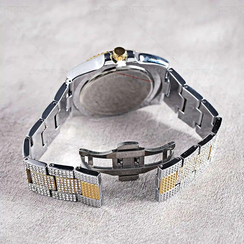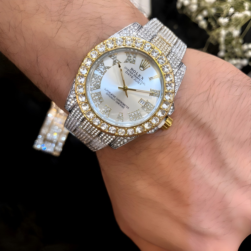 دارای روز شمار رنگ طلایی سیلور قاب نگینی قفل پروانه ای استیل صفحه نگینی بند استیل حروف یونانی تقویم تلسکوپی به همراه جعبه مخصوص و باتری اضافه