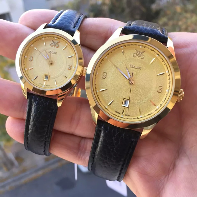 ست ساعت مچی عقربه ای زنانه و مردانه اوبلاک مدل 72699 رنگ طلایی صفحه زرد