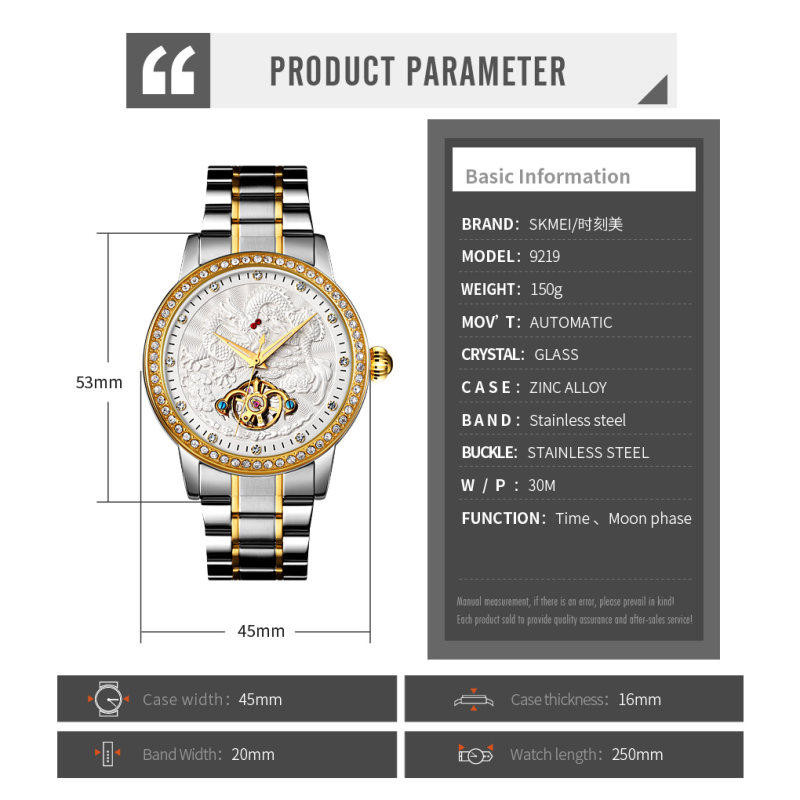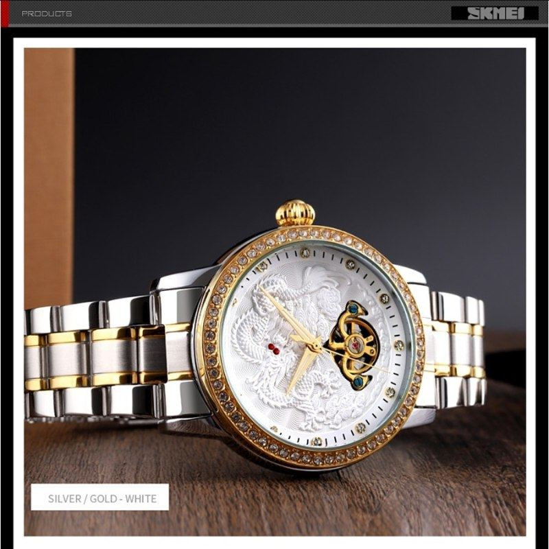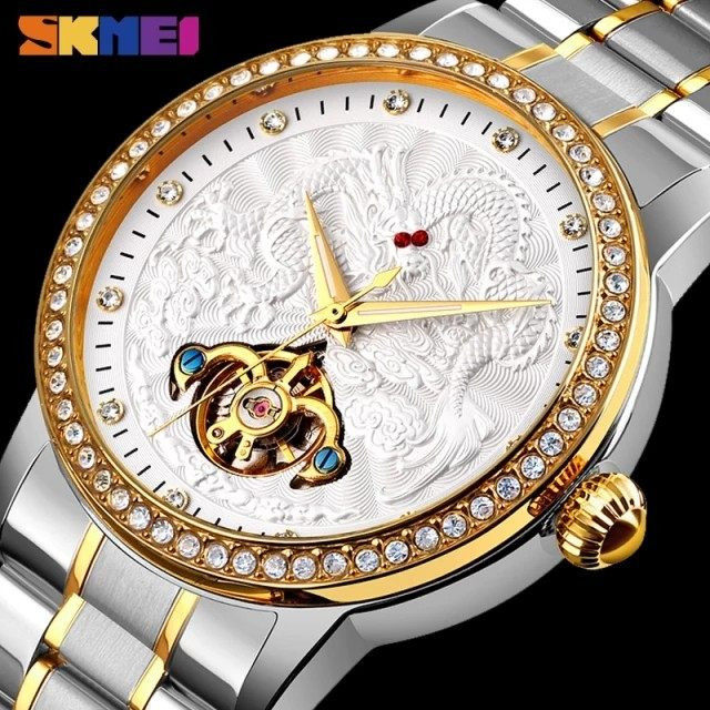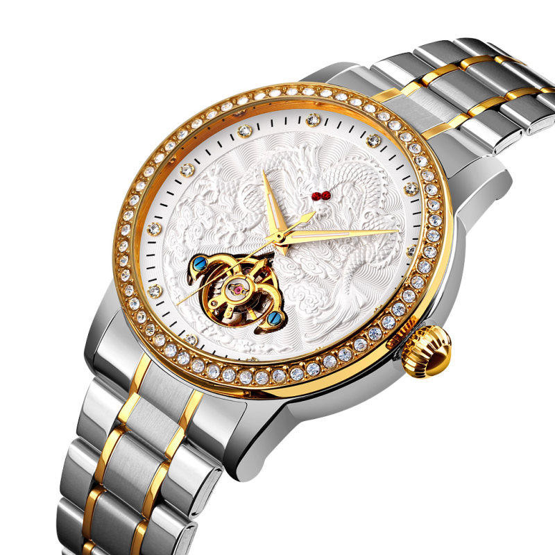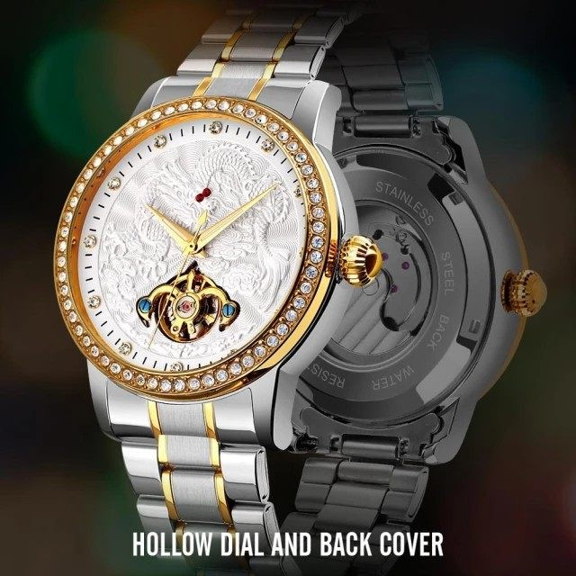 موتور اتومات ژاپن (بدون نیاز به باتری) صفحه طرح برجسته طرح اژدها قاب و بند فول استیل قاب فول نگین (اتم مخراجکاری شده) شیشه کریستال ضدخش قاب پشت شیشه نشکن (موتور پیدا) ضدآب در حد دست شستن