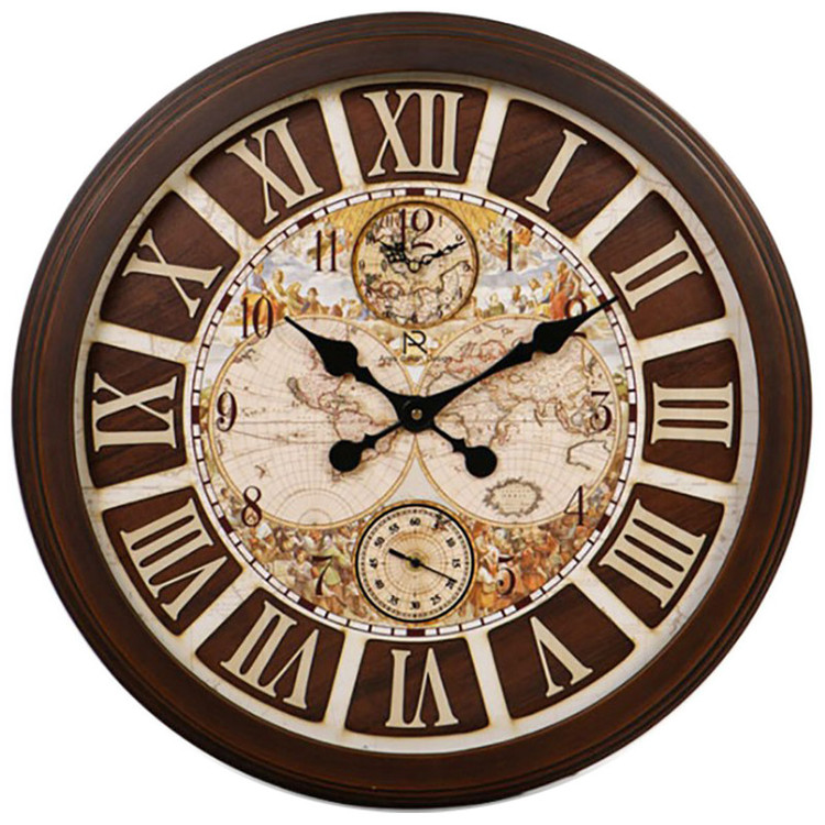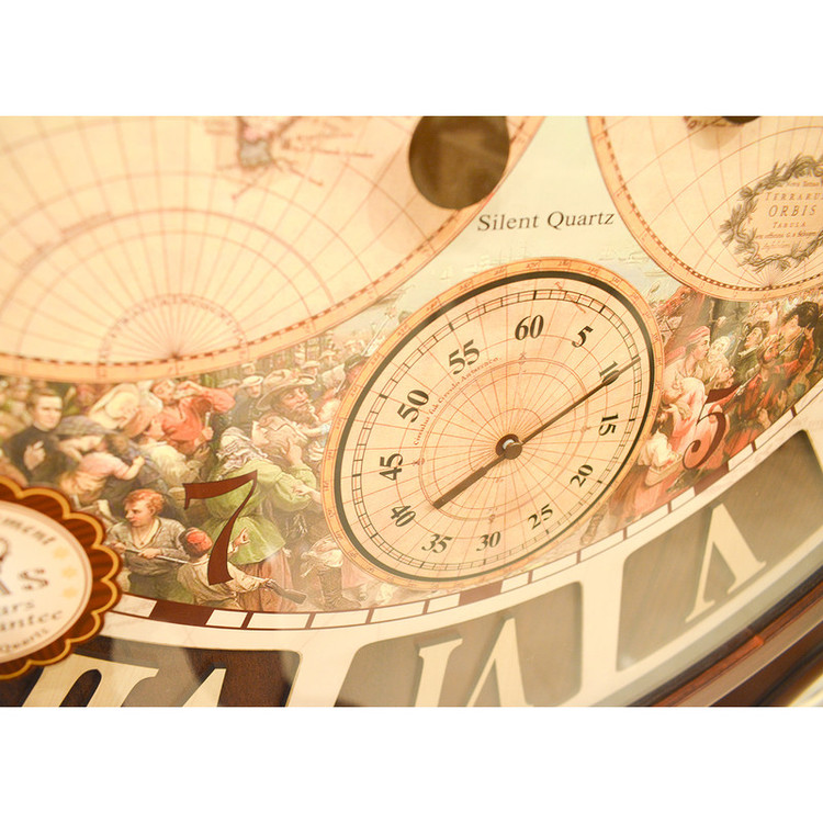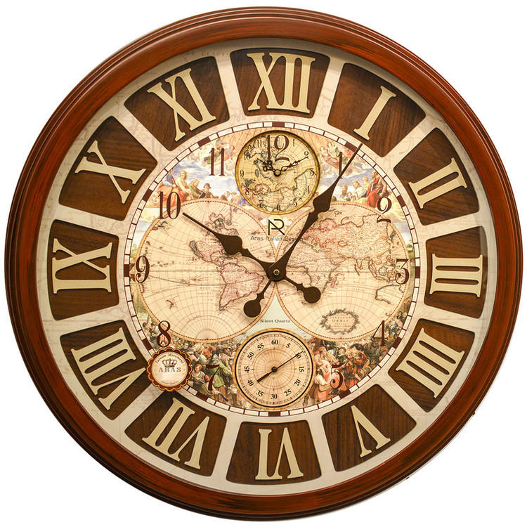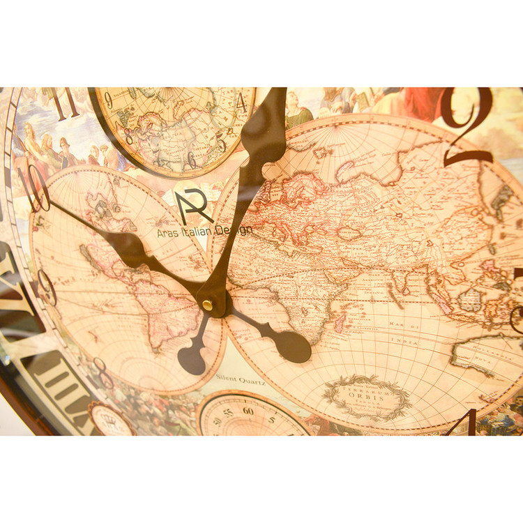 این ساعت ساخت شرکت ارس میباشد که در صفحه ساعت طرح بسیار زیبا از نقشه قاره های کره زمین و همچنین در حاشیه های آن طرح هایی از نقاشی های روم باستان قرار دارد که این باعث شده این کالا هم به عنوان یک تابلو زیبا استفاده شود و هم بعنوان یک ساعت زیبا ! این ساعت دارای 3 موتور روانگرد و بدون صدا با مصرف کم باتری است که به 2 زمان متفاوت قابل تنظیم است و موتور دیگر نمایشگر ثانیه است. موتور های این ساعت روانگرد و بدون صدا با مصرف کم باتری میباشد. قاب این ساعت از کائوچو ساخته شده است.