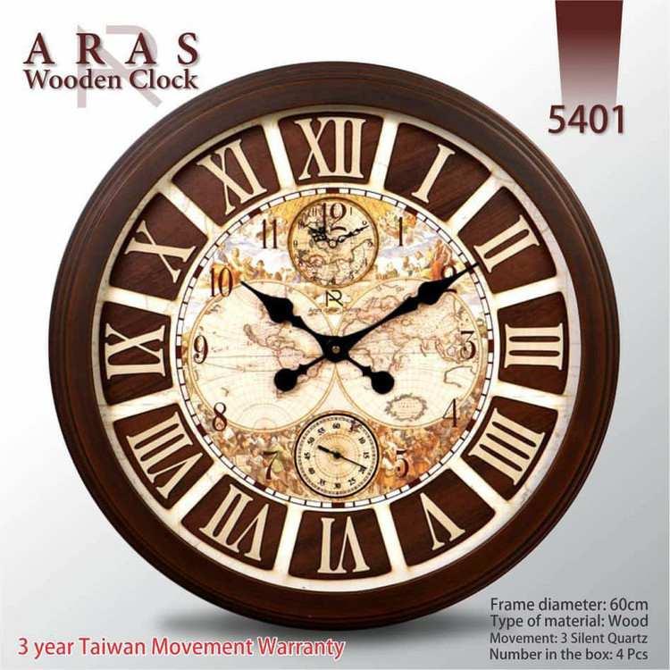 این ساعت ساخت شرکت ارس میباشد که در صفحه ساعت طرح بسیار زیبا از نقشه قاره های کره زمین و همچنین در حاشیه های آن طرح هایی از نقاشی های روم باستان قرار دارد که این باعث شده این کالا هم به عنوان یک تابلو زیبا استفاده شود و هم بعنوان یک ساعت زیبا ! این ساعت دارای 3 موتور روانگرد و بدون صدا با مصرف کم باتری است که به 2 زمان متفاوت قابل تنظیم است و موتور دیگر نمایشگر ثانیه است. موتور های این ساعت روانگرد و بدون صدا با مصرف کم باتری میباشد. ساعت ساخته از چوب و قطر آن 60 سانتی متر میباشد.