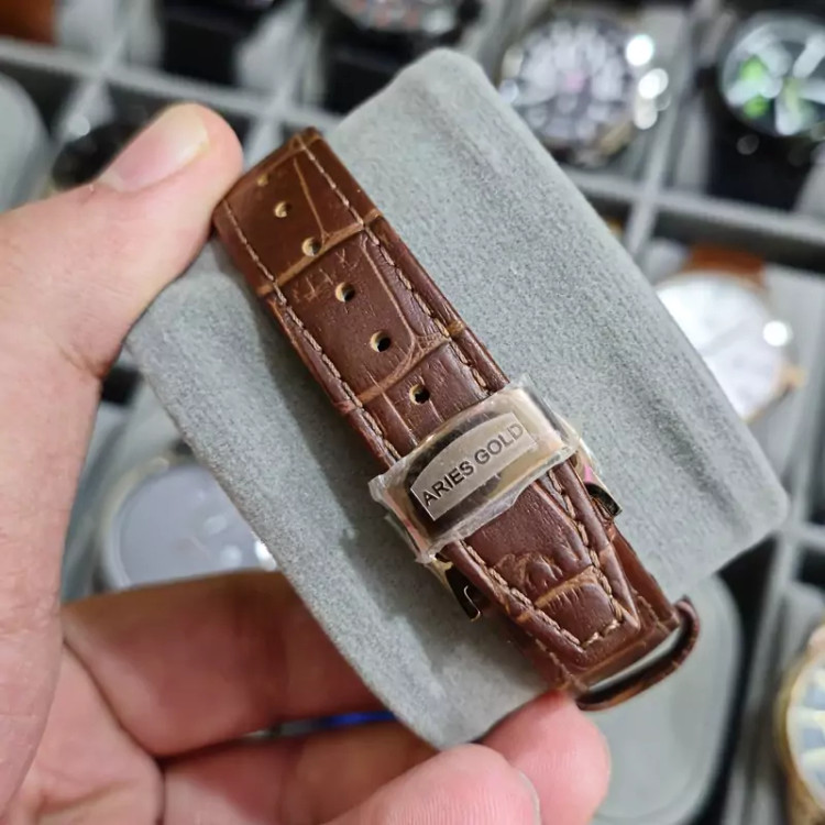 ساعت مچی عقربه ای زنانه آریس گلد مومنت ژاپن ضد آب بند چرم طبیعی رنگ ثابت بدنه استیل ضد حساسیت