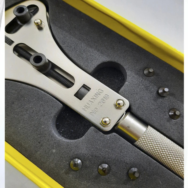 آچار جاکس ساعت هواکسینگ مدل H2819 سایز 3 اینچ یک آچار سایز بزرگ مخصوص بازکردن درب ساعت های مچی کاربرد داشته و یک ابزار حرفه ای میباشد که دارای 12 عدد یدکی فولادی بوده که به صورت دقیق روی در ساعت فیکس میشود و از ایجاد خط و خش جلوگیری میکند و جنس این جاکس استیل ضد زنگ میباشد که تمامی ساعت های مچی را پوشش میدهد.